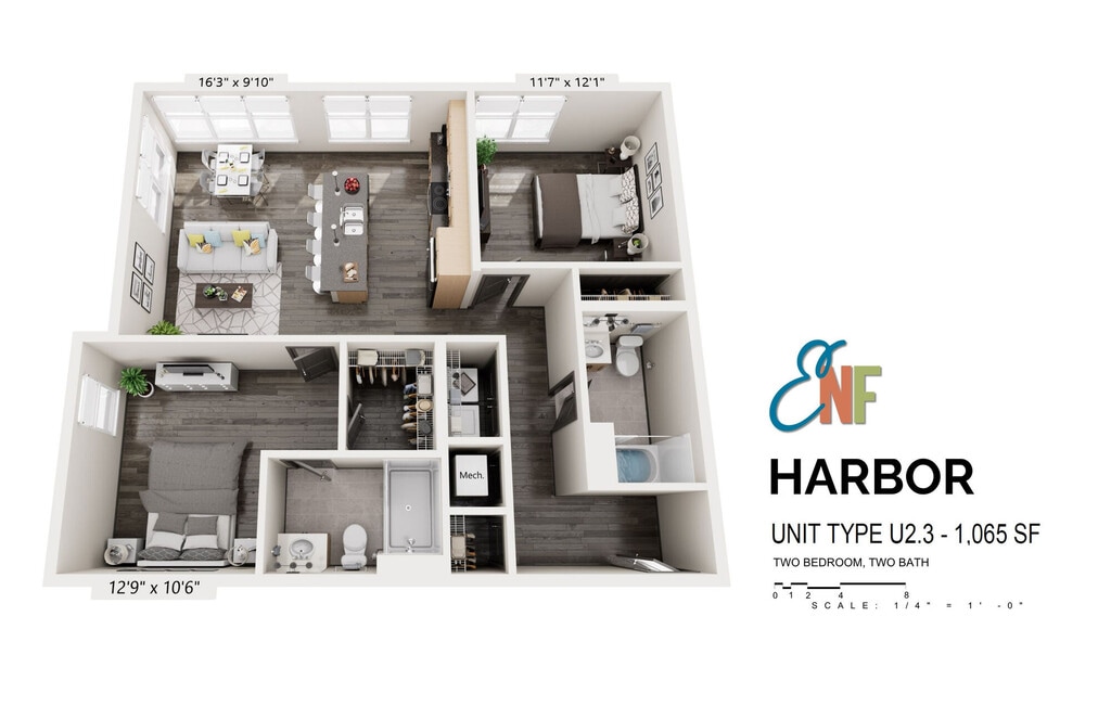 Modelo de apartamento: HarborDesde $6602 Dormitorios, 2 Baños, 1065 sq ftDisponible June 15, 2026![]()