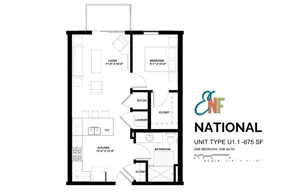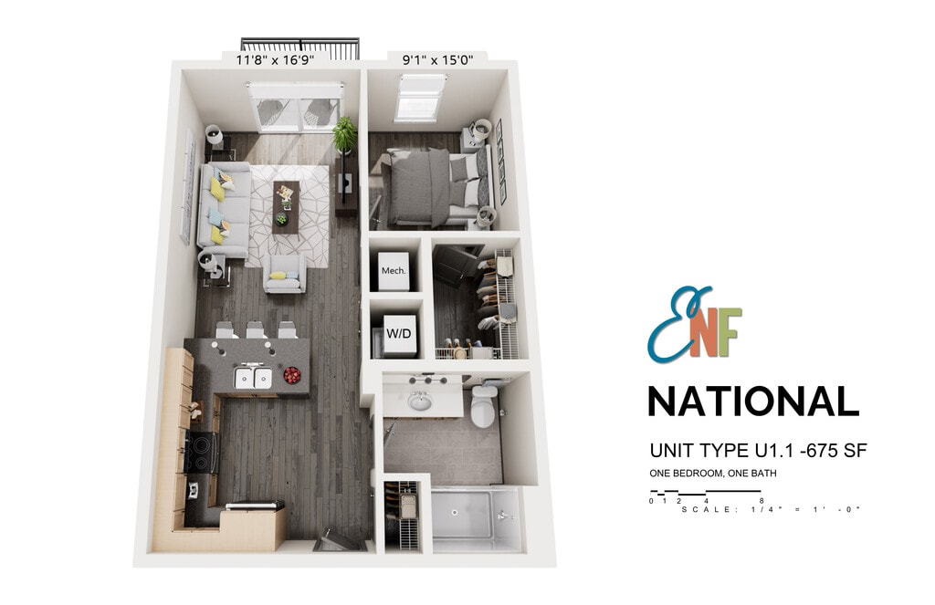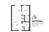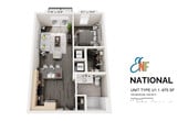 Modelo de apartamento: NationalDesde $5541 Dormitorio, 1 Baño, 675 sq ftDisponible June 15, 2026![]()