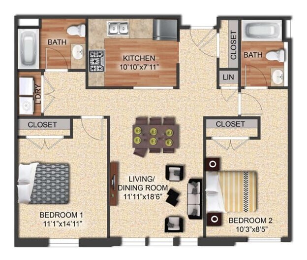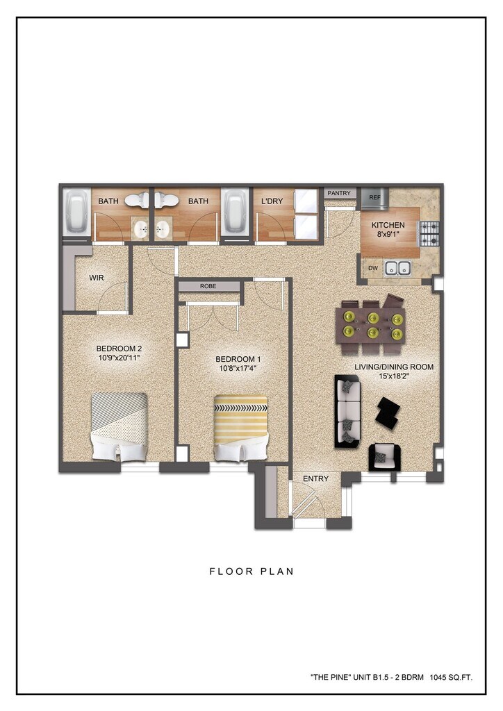 1 Bedroom, Market, Willow/Walnut Floorplan - Plano 1 2 Dormitorios
