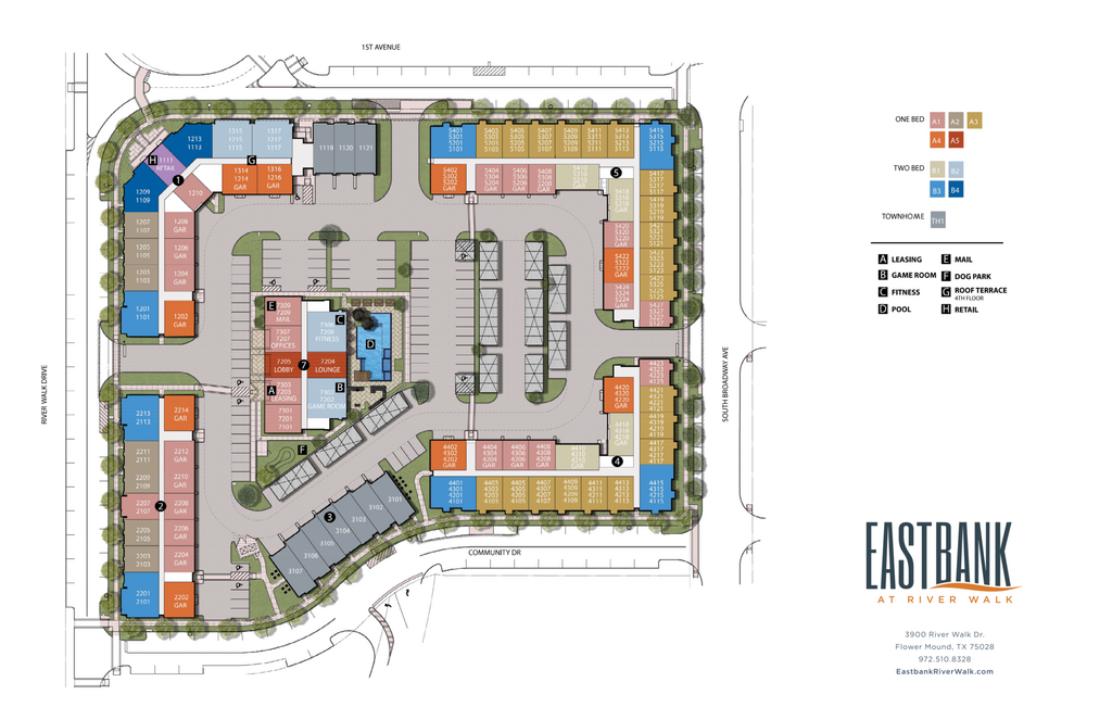 Eastbank River Walk se encuentra en el Barrio Lewisville Flower Mound y el código postal 75028 de Flower Mound, TX. Esta comunidad está gestionada profesionalmente por Greystar Real Estate Partners