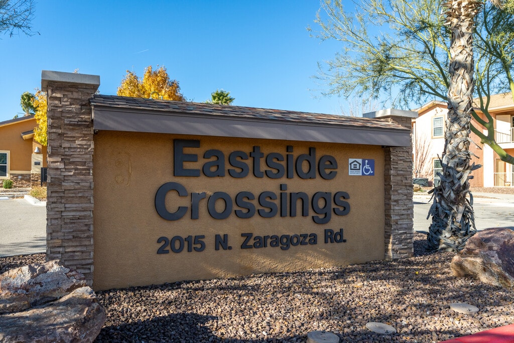 Eastside Crossings cuenta con 74 apartamentos de alojamiento público, 79 apartamentos de vivienda asequibles, y 45 apartamentos con tarifas de mercado. La propiedad cuenta con una variedad de servicios atractivos para todos los residentes, que incluyen una casa club con un gimnasio, una piscina de natación, parrillas para barbacoa, sendero para caminar, dos áreas de juegos infantiles cubiertas, y lugares de estacionamiento cubierto. De acuerdo con los requisitos federales, la propiedad también cuenta con 10 completamente accesible para personas con discapacidades y 4 unidades de apartamentos para personas con problemas de audición y visión los residentes. Todos los apartamentos tienen electrodomésticos Energy Star que incluyen refrigerador, lavadora de platos, lavadoras y secadoras, y aire acondicionado y calefacción central. El nombre "Eastside Crossings in es un reflejo de tu ubicación en el área este de la ciudad y tu ubicación en la esquina de dos carreteras principales, North Zaragoza y Joe Battle.