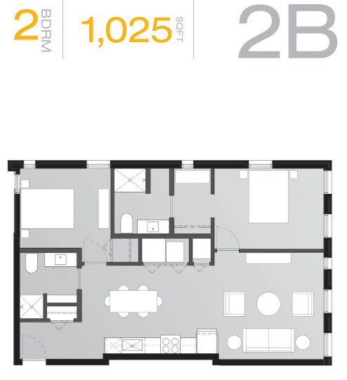 Modelo de apartamento: 2B$1,6952 Dormitorios, 2 Baños, 1025 sq ftDisponible Ahora![]()