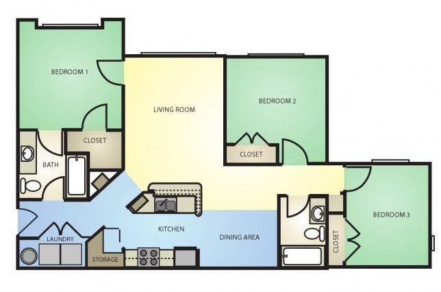 3 Bed 2 Bath - Plano 1 Unidad de apartamento: 7106Modelo de apartamento: 3 Bed 2 Bath$1,6343 Dormitorios, 2 Baños, 1127 sq ftDisponible December 7, 2025