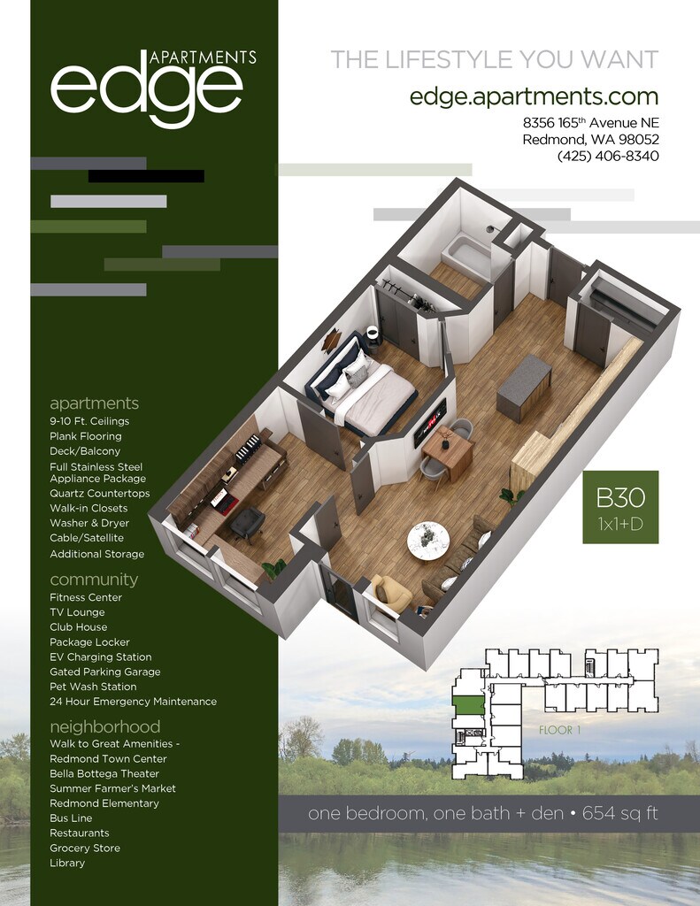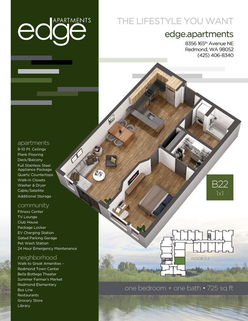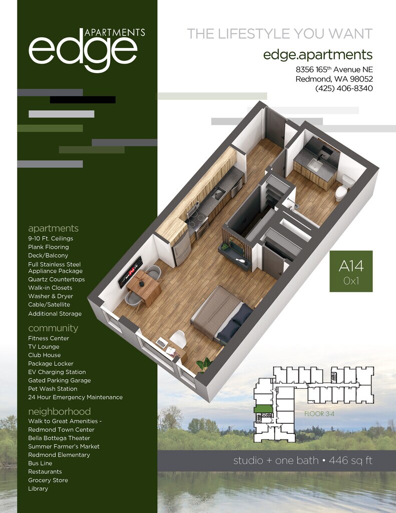 Edge Apartments se encuentra en el Barrio Downtown Redmond y el código postal 98052 de Redmond, WA. Esta comunidad está gestionada profesionalmente por Precision Management