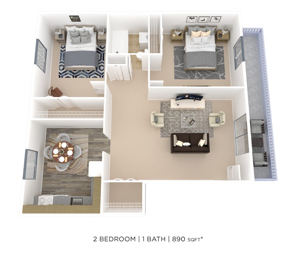 2 Dormitorios, 1 Baño, 890 pies²Disponible Dec 21Galería del Modelo