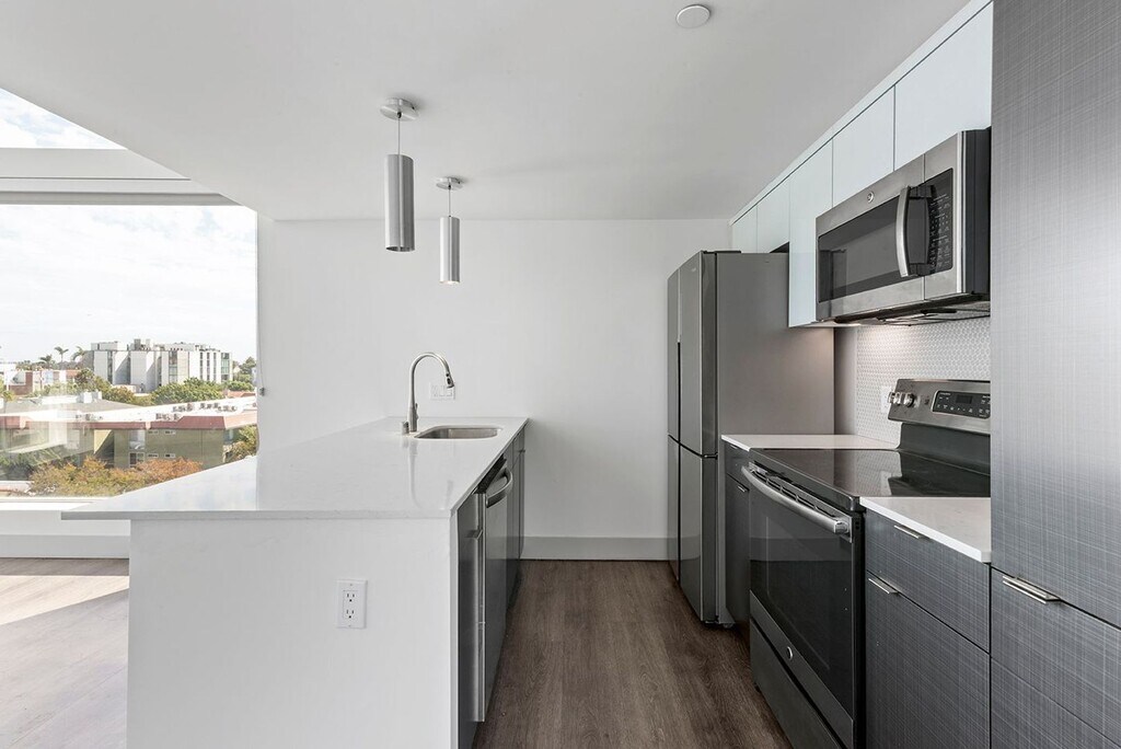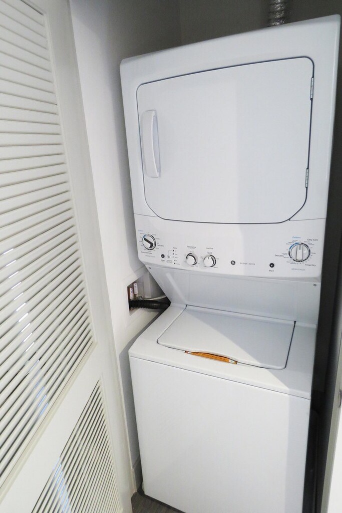- Microondas, lavadora/secadora apilables, lavavajillas, fregadero, triturador de basura, placa de cocina/horno, refrigerador