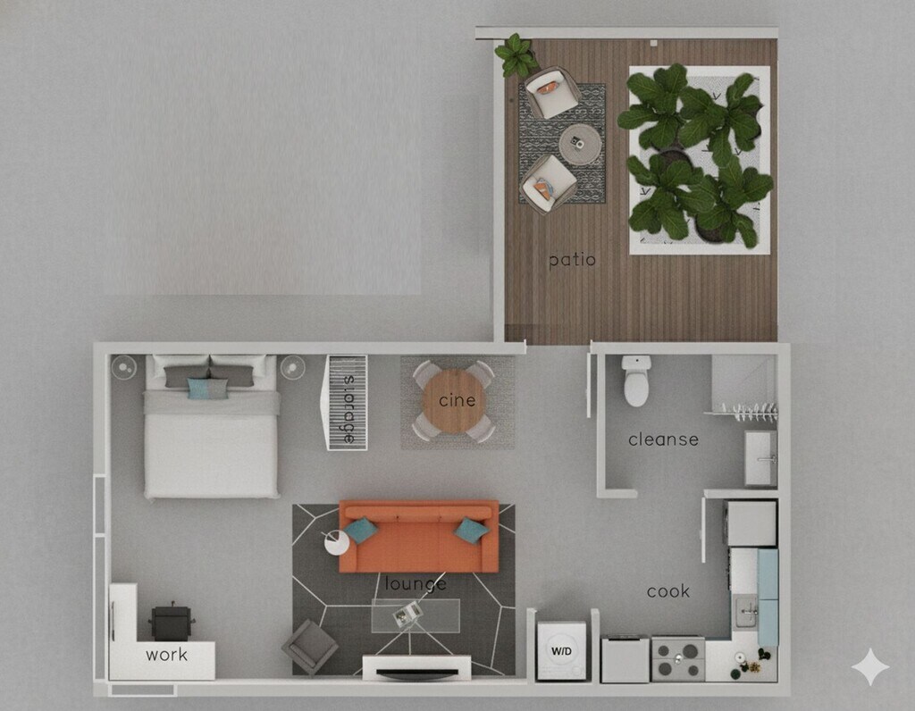 1 Dormitorio, 1 Baño, 600 pies²Disponible AhoraGalería del Modelo