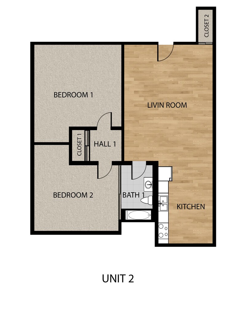 2 Dormitorios, 1 Baño, 800 pies²Disponible AhoraGalería del Modelo