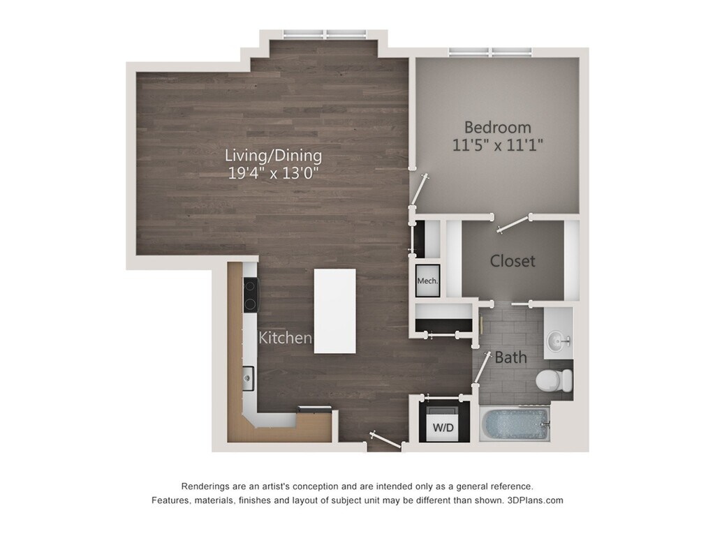 Studio (539 SF) - Plano 1 Los planos de la planta son una interpretación artística. Todas las dimensiones son aproximadas. Los tamaños o el detalle del producto real y sus especificaciones pueden variar. No todas las características están disponibles en todos los hogares para rentar. Los precios y la disponibilidad están sujetos a cambios. El alquiler que se muestra es mensual. Se pueden aplicar ciertos cargos, por ejemplo, entrega de paquetes, recolección de basura, agua, servicios, etc. Depositos varian. Consulta a un representante para conocer detalles.