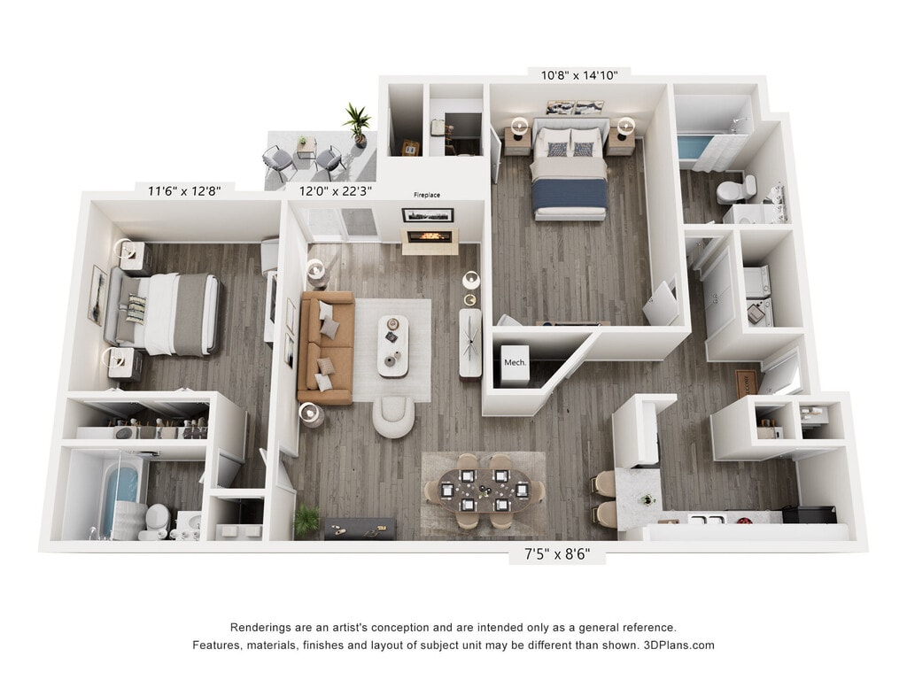 Modelo de apartamento: Two Bed/Two Bath 1137 sq .ft.Desde $1,3492 Dormitorios, 2 Baños, 1137 sq ftDisponible AhoraLos planos son representaciones artísticas. Todas las dimensiones son aproximadas. El producto y las especificaciones reales pueden variar en tamaño o detalle. No todas las características están disponibles en cada vivienda en alquiler. Por favor, consulta con un representante para obtener más detalles.