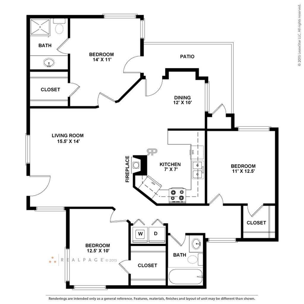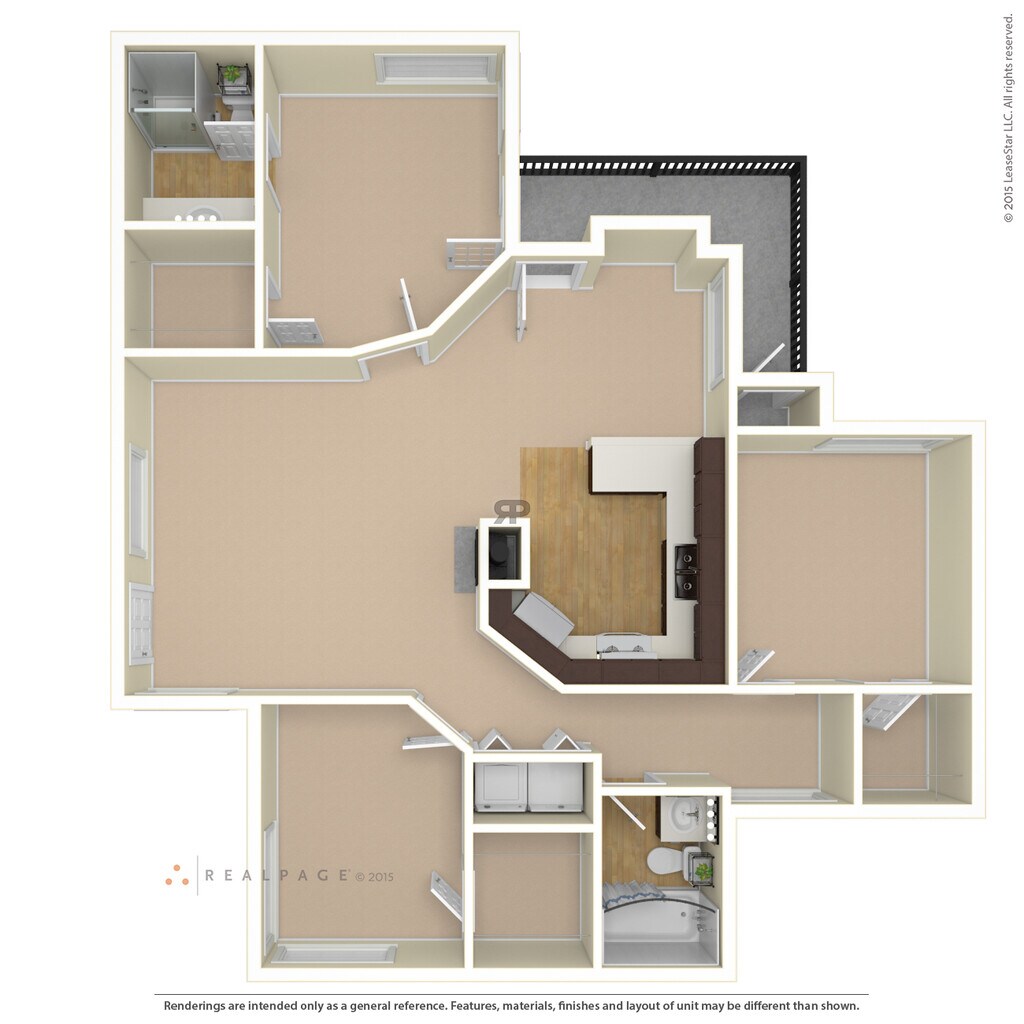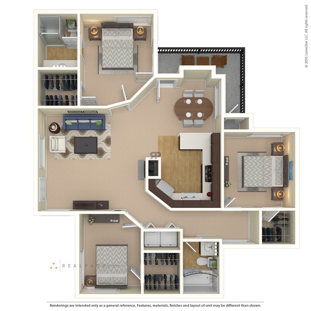 Bungalow - Plano 5 Unidad de apartamento: 1801Modelo de apartamento: Bungalow2 Dormitorios, 2 Baños, 1195 sq ftDisponible November 21, 20253 Dormitorios