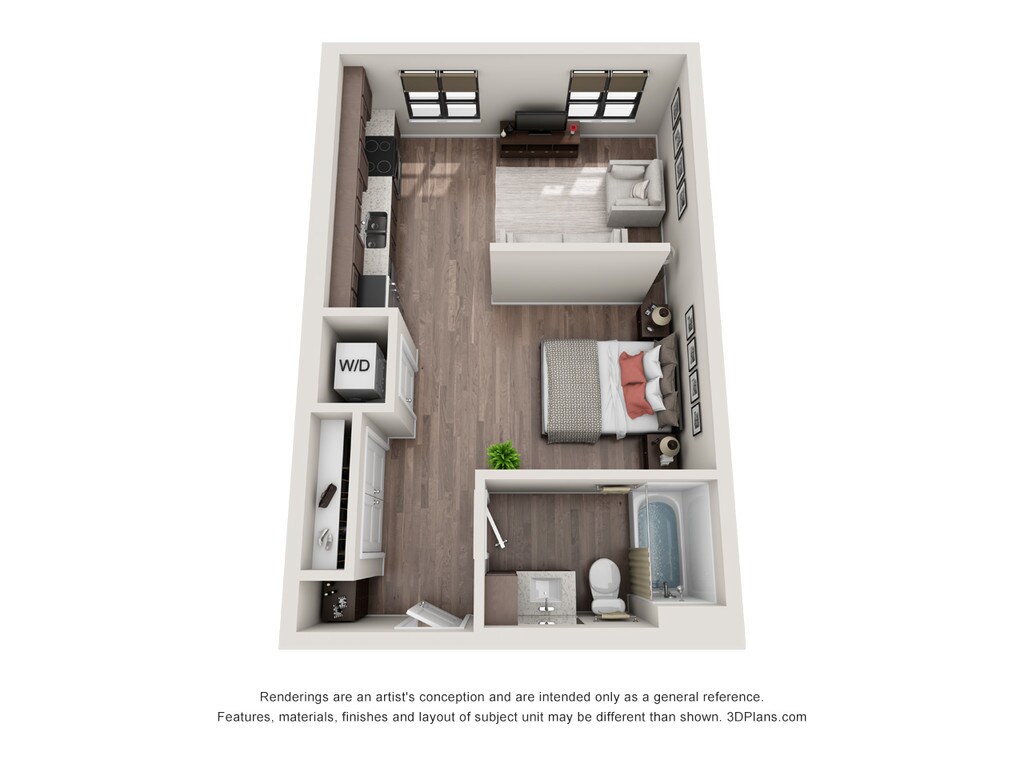 Modelo de apartamento: Willow - Income RestrictedLlame para PreciosEstudio, 1 Baño, 497 sq ftDisponible Ahora![]()