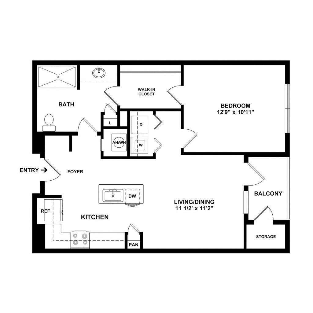 Modelo de apartamento: A1Desde $2,1851 Dormitorio, 1 Baño, 725 sq ftDisponible Ahora![]()