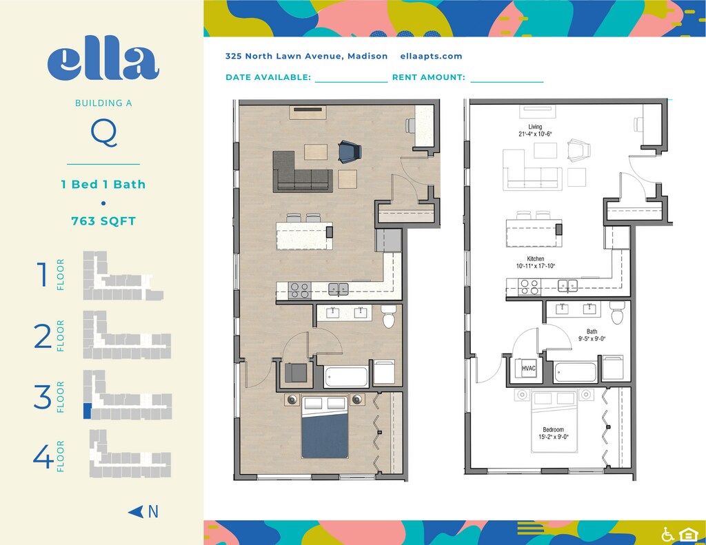 Colorida, enérgica y llena de luz, Ella ofrece apartamentos asequibles de una y dos habitaciones, y es perfecta para aquellos que desean acabados cálidos pero contemporáneos. Escondido en el tranquilo vecindario de Eken Park, el exterior con murales de Ella emula con orgullo este bolsillo vibrante y diverso de Madison. Quédate y relájate en nuestro salón comunitario y terraza, haz ejercicio en el gimnasio en el lugar o come algo en uno de los muchos restaurantes y tabernas cercanos. No importa el deseo, la amplia gama de comodidades de Ella seguramente te impresionará. La proximidad al centro de la ciudad junto con las comodidades del lado este de Madison hace que la vida cotidiana sea libre de problemas. ¡Anímate a volver a casa y amar el lugar donde vives en Ella!