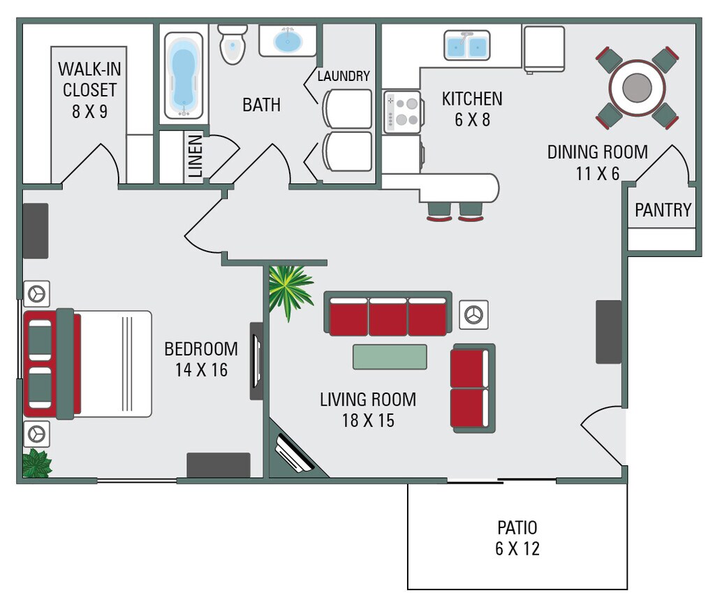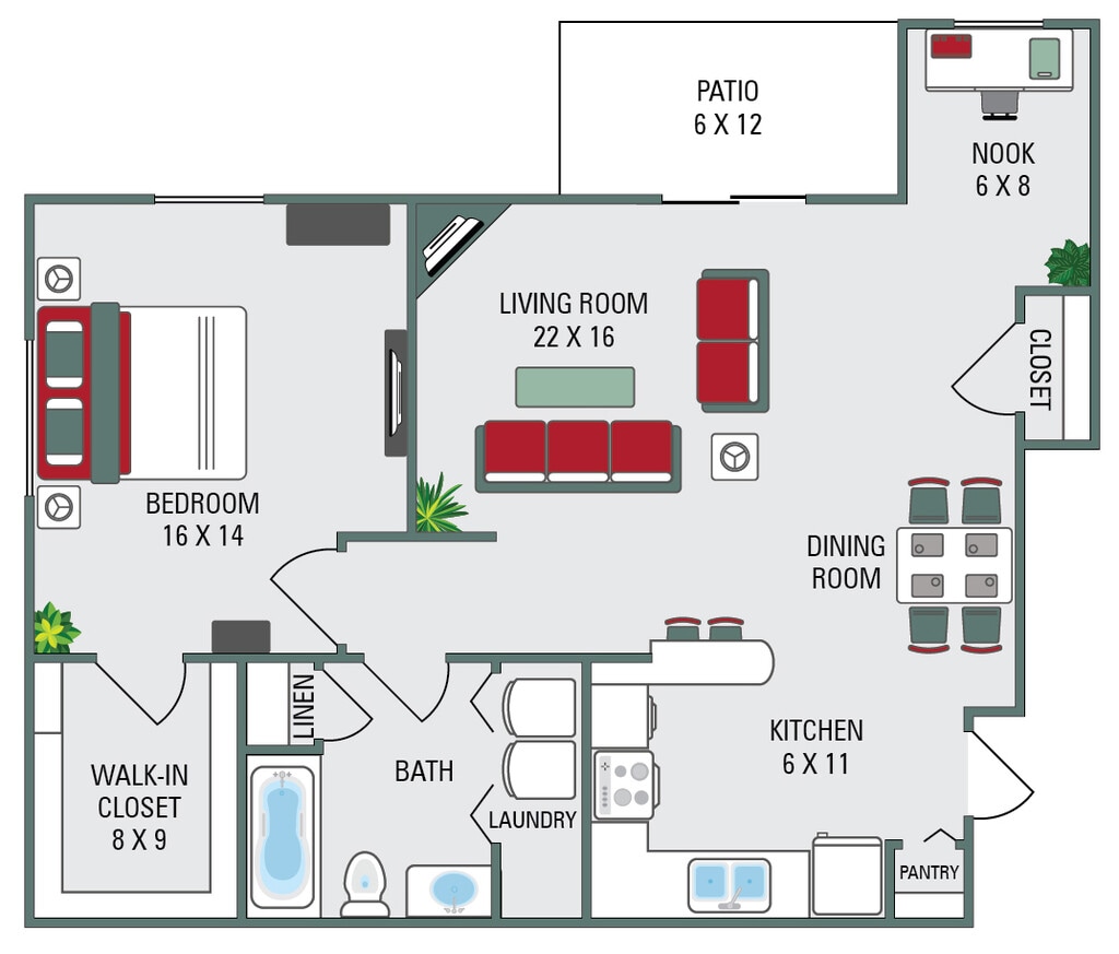Modelo de apartamento: The Silverstone - 895-975 SqftDesde $1,0951 Dormitorio, 1 Baño, 895-975 sq ftDisponible Ahora![]()