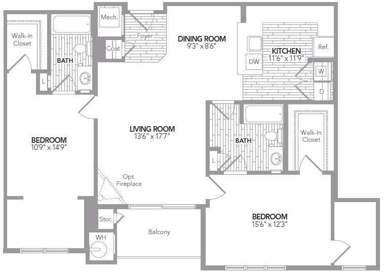 Modelo de apartamento: CS-2-A2 Dormitorios, 2 Baños, 1249 sq ftDisponible Ahora![]()