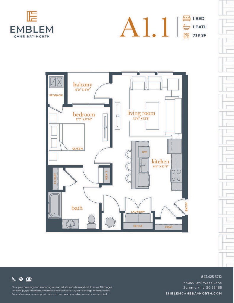 Modelo de apartamento: A1.1$1,4631 Dormitorio, 1 Baño, 738 sq ftNo DisponibleA1.1 - Plano 1 2 Dormitorios