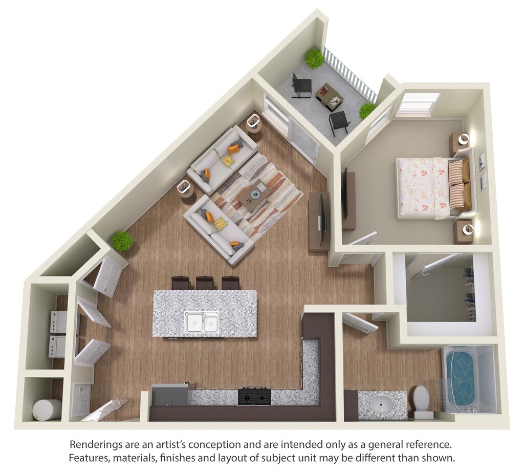 Modelo de apartamento: 1 Bed - A1Desde $6691 Dormitorio, 1 Baño, 685 sq ftDisponible Ahora![]()