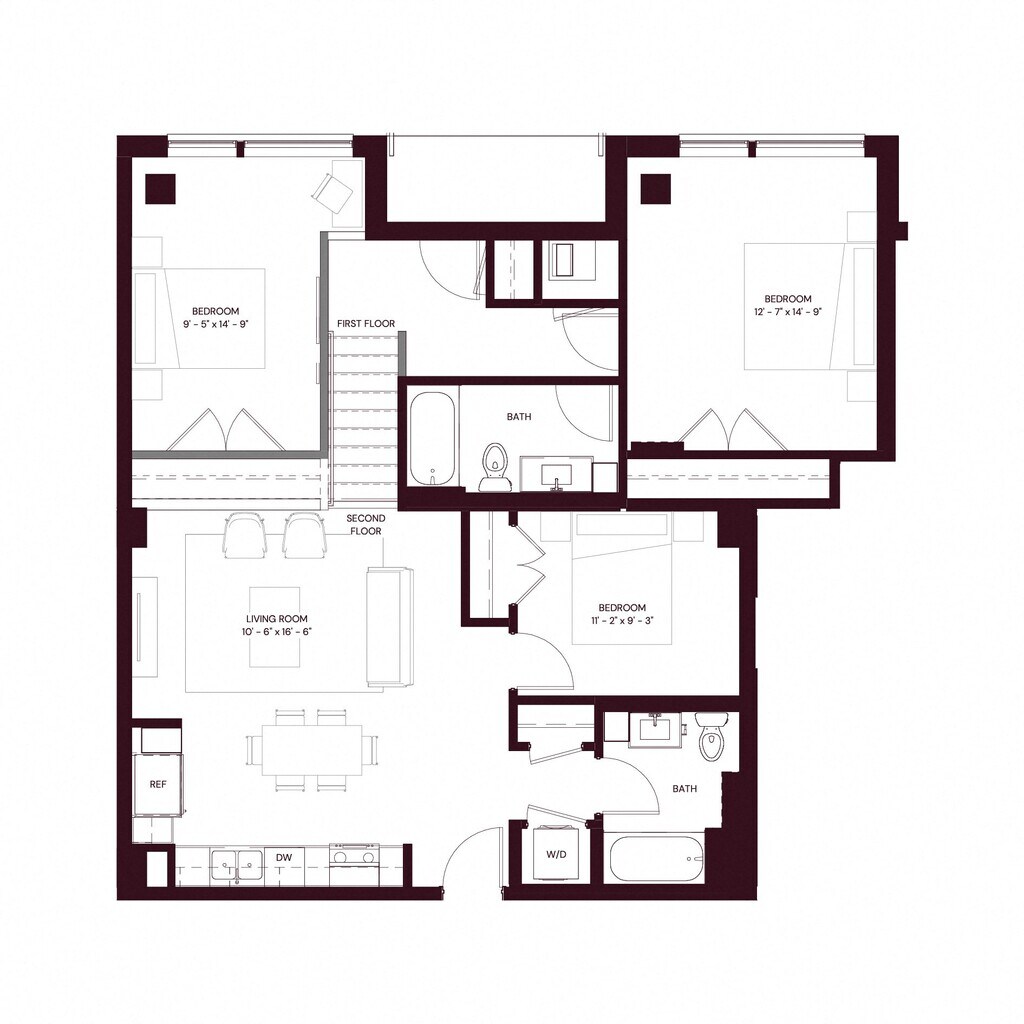 Modelo de apartamento: Thomas1 Dormitorio, 1 Baño, 595 sq ftDisponible Ahora![]()