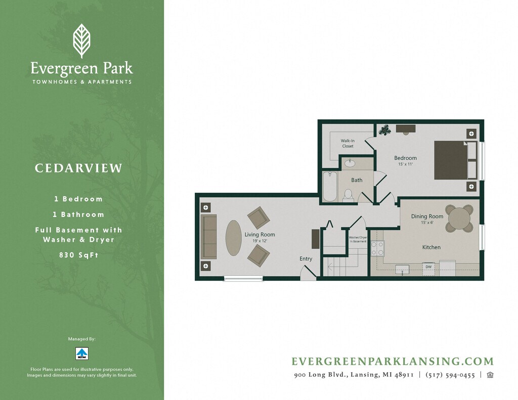 Modelo de apartamento: CedarviewDesde $1,0501 Dormitorio, 1 Baño, 830 sq ftDisponible Ahora![]()