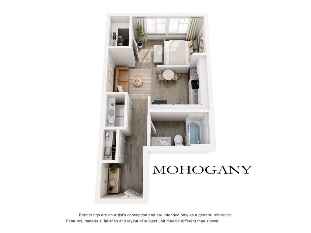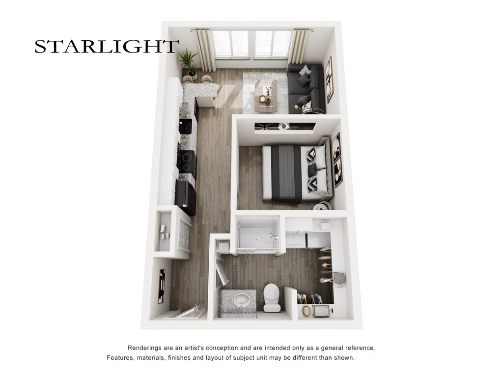 Modelo de apartamento: Mahogany$850Estudio, 1 Baño, 450 sq ftDisponible October 28, 2025Mahogany - Plano 1 Starlight