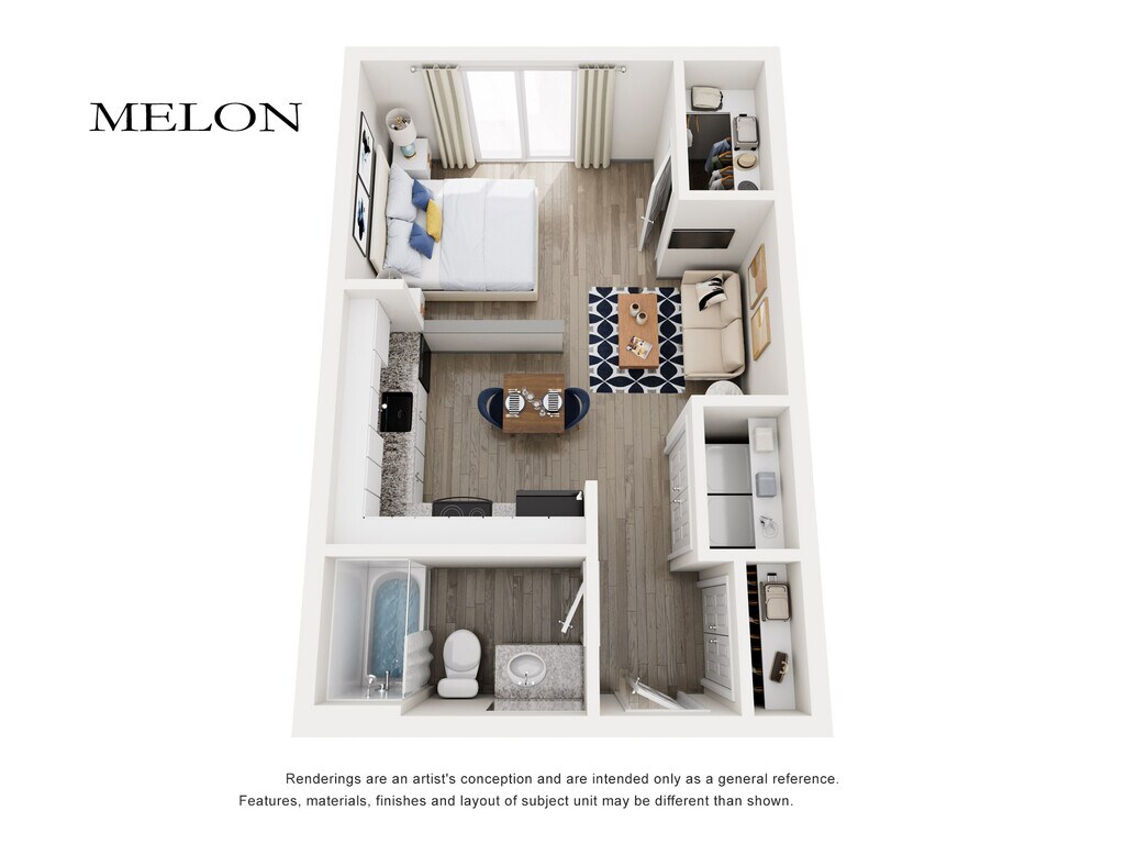 Modelo de apartamento: Melon$850Estudio, 1 Baño, 449 sq ftNo DisponibleMelon - Plano 1 Sunglow