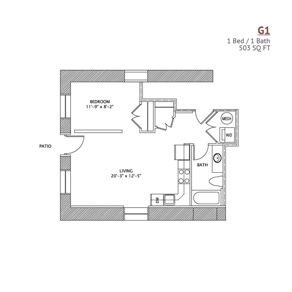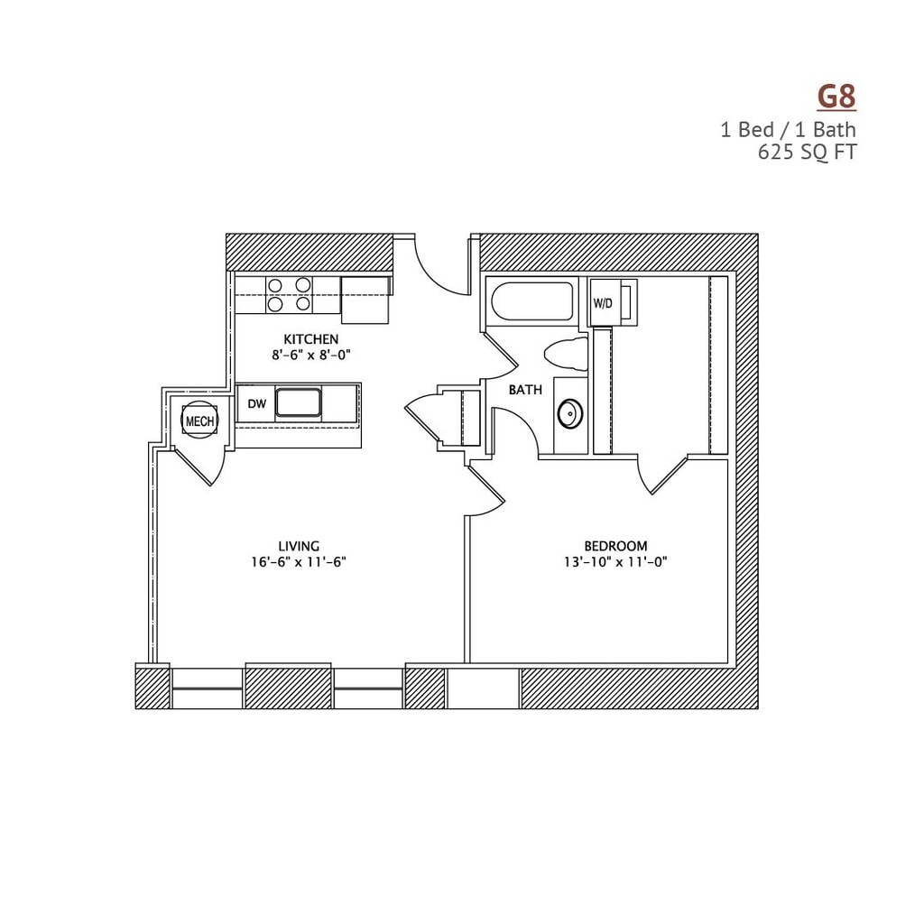 Unidad: G1 - Imagen 10 Unidad de apartamento: G8Modelo de apartamento: 1BR/1.0BA$9001 Dormitorio, 1 Baño, 625 sq ftDisponible Ahora![]()