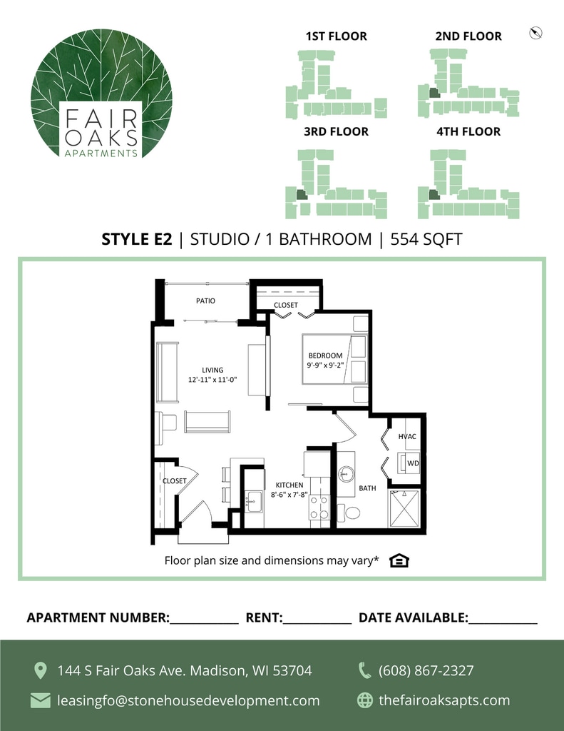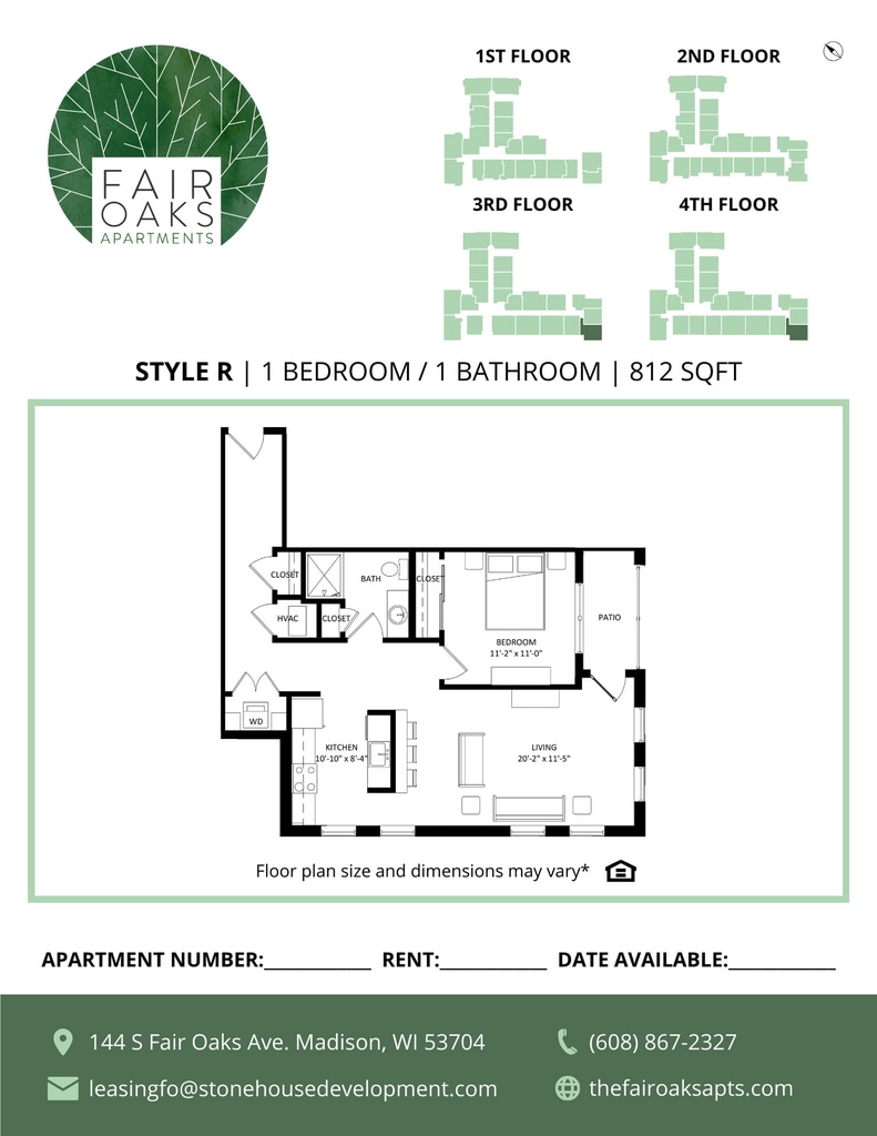 Fair Oaks es un fascinante complejo de apartamentos nuevo para NO FUMADORES ubicado en el vibrante y activo vecindario de Atwood en Madison. La ubicación de Fair Oaks Apartments ofrece un fácil acceso a medios de transporte, restaurantes, mercado de agricultores, tiendas y varios eventos en el complejo, y está a solo unos pasos de distancia de Olbrich Gardens, parques de la ciudad, el lago Monona y una red de senderos peatonales o para andar en bicicleta. Los residentes tienen acceso a un gimnasio, salón comunitario, jardines comunitarios y área de juegos para niños. Las comodidades adicionales incluyen administración en el lugar, mantenimiento de emergencia las 24 horas, almacenaje para bicicletas y conexión Wi-Fi gratuita en todo la propiedad.