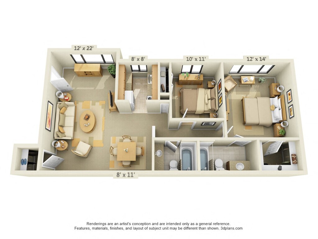 2 Dormitorios, 1 Baño, 950-1075 pies²Galería del Modelo