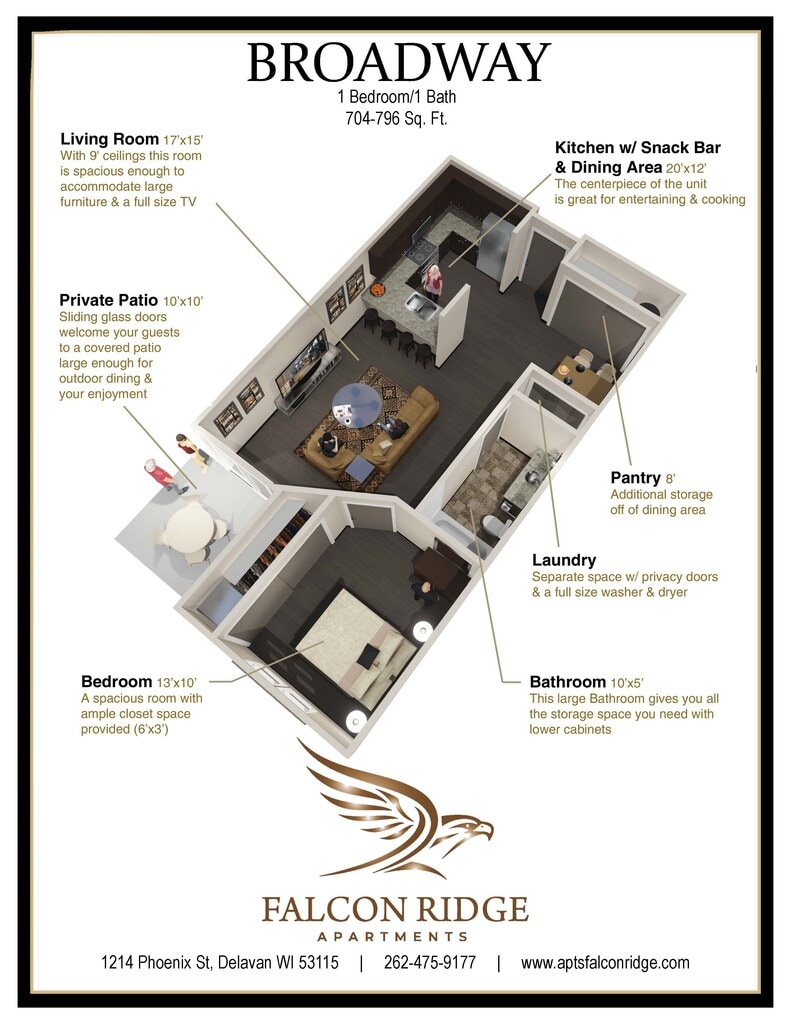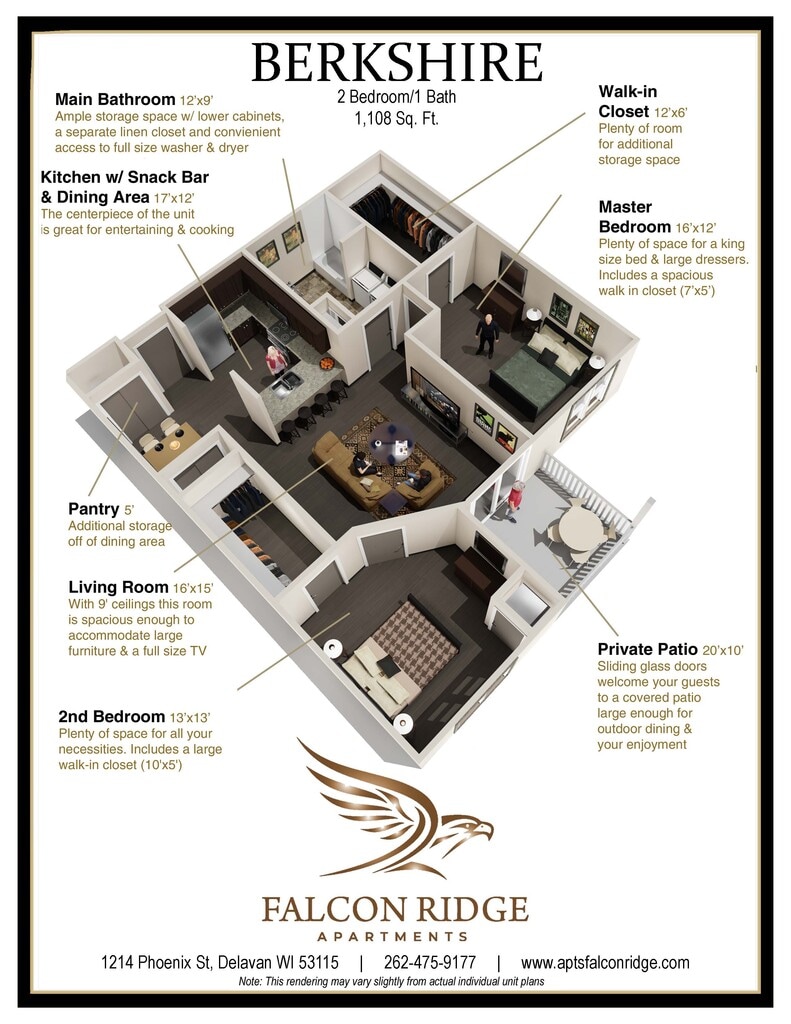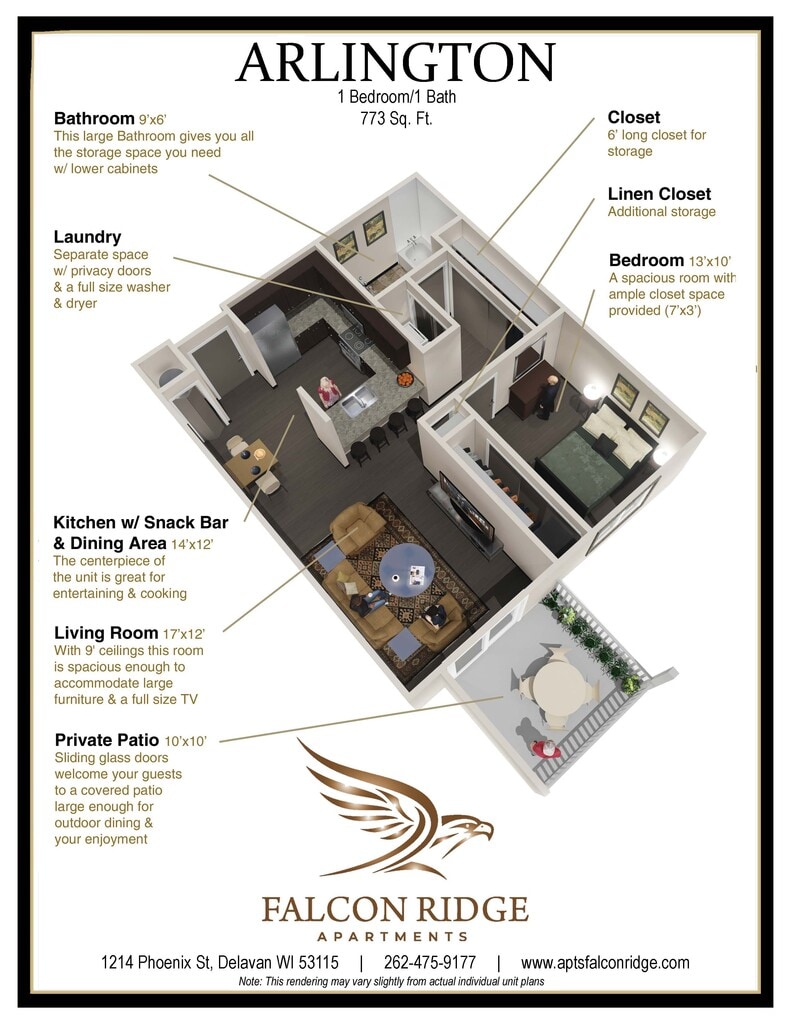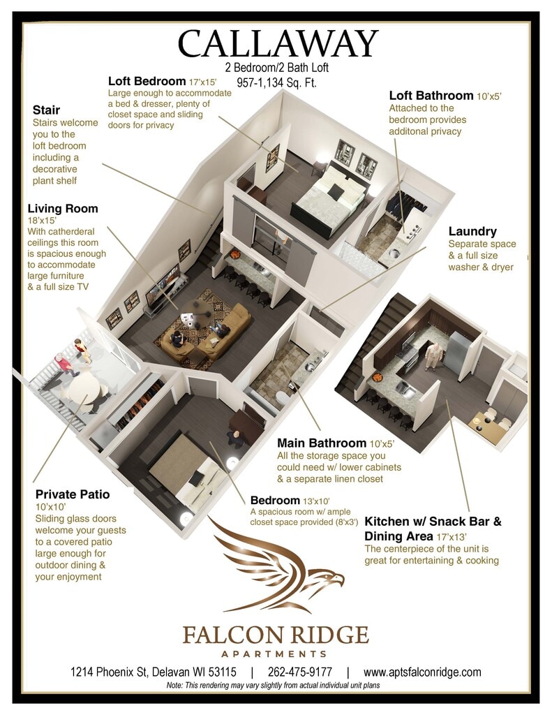 At Falcon Ridge, you can truly live your way. Falcon Ridge has multitude of options featuring 1, 2, 3, 4 and Loft bedroom apartments so you can choose the home that best suits your needs. Our state of the art amenities and friendly staff make Falcon Ridge feel like home. Falcon Ridge is an exciting, NEW neighborhood development located in Delavan, WI adjacent to Fest Park and just seconds from I-43 and Hwy 50. Falcon Ridge Apartments is ready to welcome you home. Elevator, Intercom Entry System, underground parking, full size washers and dryers in every unit, central air, walk-in closets (in most units), LG stainless steel appliances, plank flooring, cable and internet included, fitness center and much, much more.