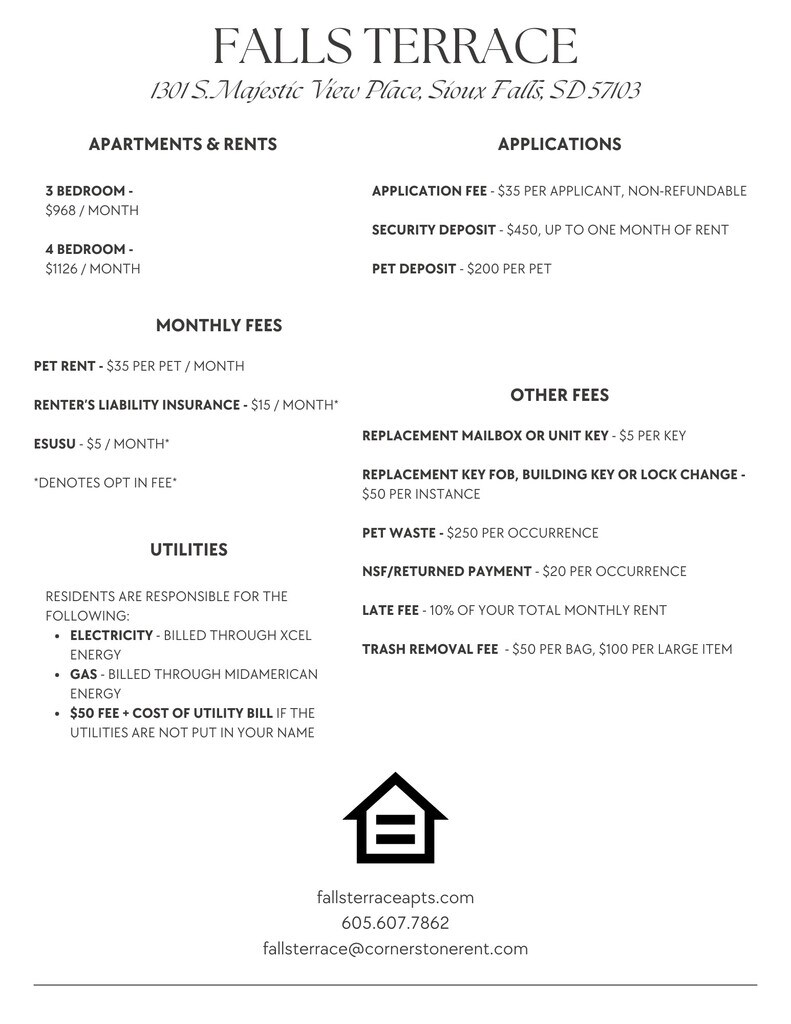 Nuestro amigable complejo está ubicado a minutos de las tiendas y los restaurantes del centro de Sioux Falls, así como de los senderos de Falls Park, las áreas de pícnic y, por supuesto, las magníficas cataratas. Tenemos hogares amplios y asequibles de tres y cuatro habitaciones. Los servicios públicos de agua/alcantarillado/recolección de residuos están incluidos y cada hogar tiene su propia lavadora y secadora. ¡Te encantará vivir en Falls Terrace! Se aplican pautas de ingresos a nuestro complejo de viviendas asequible.