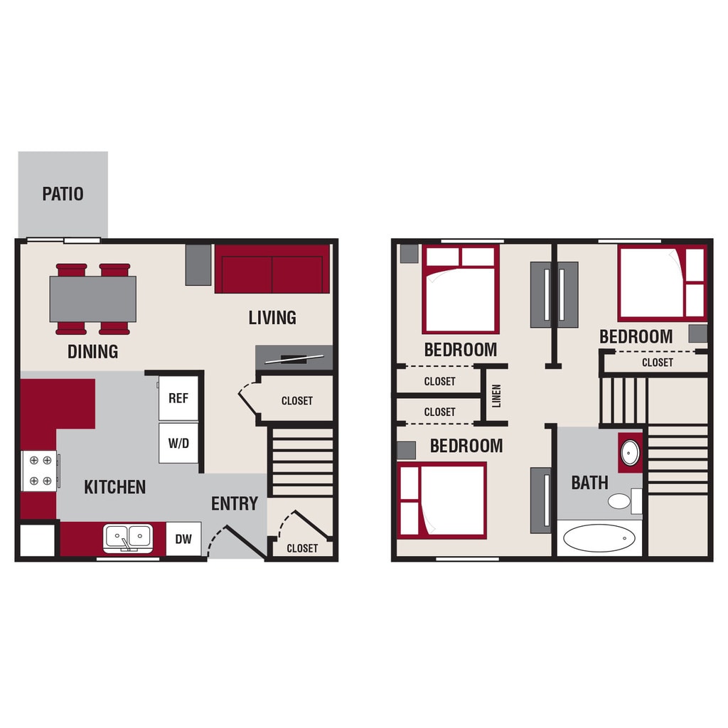 Modelo de apartamento: Three Bedroom | One BathDesde $1,2003 Dormitorios, 1 Baño, 1053 sq ftDisponible Ahora![]()