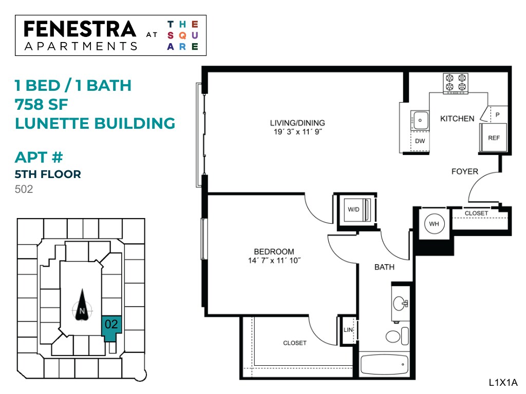Fenestra - 1 Bed/1 Bath - Plano 1 Los planos son representaciones artísticas. Todas las dimensiones son aproximadas. El producto y las especificaciones reales pueden variar en tamaño o detalle. No todas las características están disponibles en cada vivienda en alquiler. Por favor, consulta con un representante para obtener más detalles.