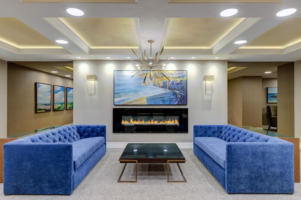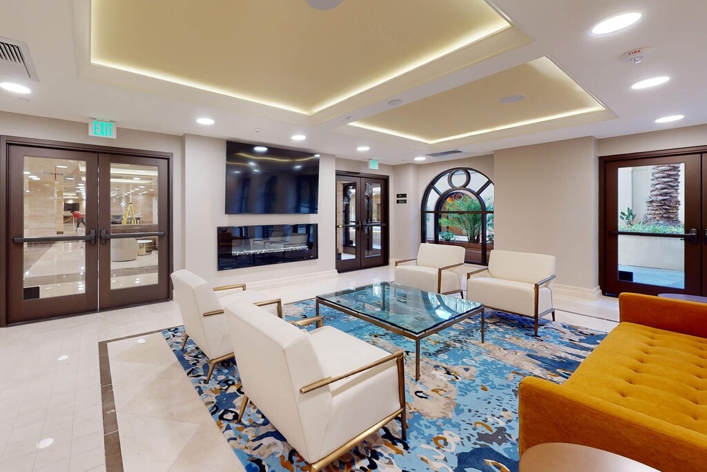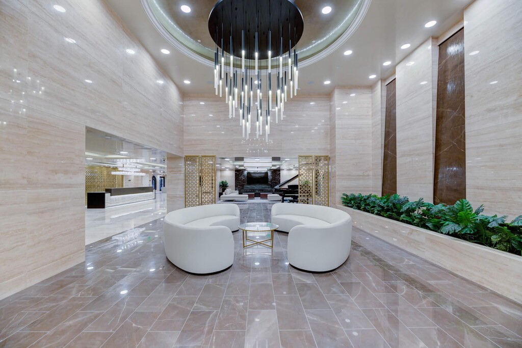 - Amplio vestíbulo con fuente de pared, arte iluminado, cafetería, áreas de espera y salón adyacente.