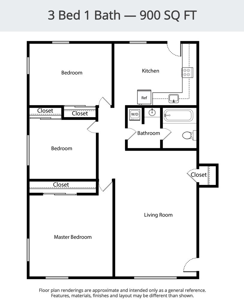 3 Dormitorios, 1 Baño, 900 pies²Disponible Oct 31Galería del Modelo