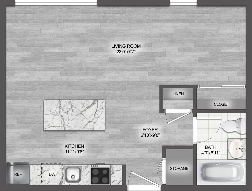 Modelo de apartamento: The TopazLlame para PreciosEstudio, 1 Baño, 425 sq ftNo DisponibleThe Topaz - Plano 1 1 Dormitorio