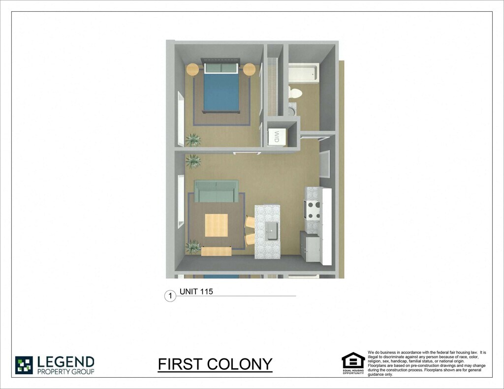 Modelo de apartamento: First Colony Flats Unit 1111 Dormitorio, 1 Baño, 693 sq ftNo DisponibleFirst Colony Flats Unit 111 - Plano 1 First Colony Flats Unit 208