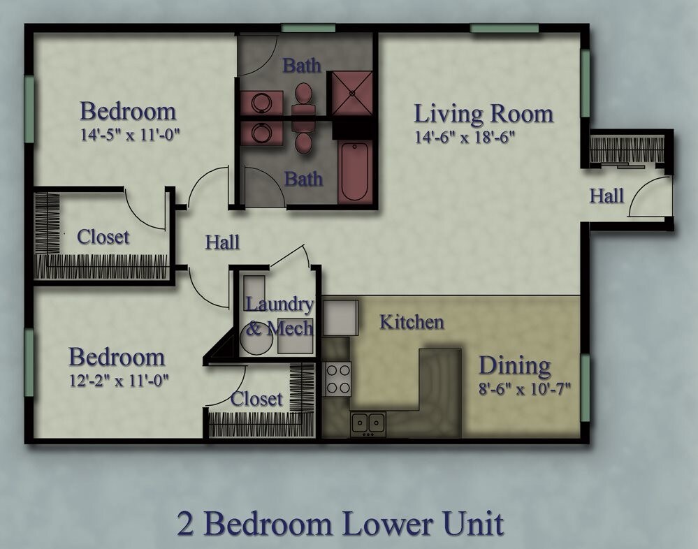 2 Dormitorios, 2 Baños, 1100 pies²Galería del Modelo