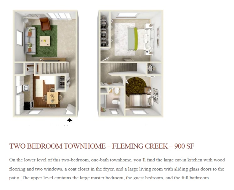 Fleming Creek Townhomes ofrece apartamentos de 1 a 2 Dormitorios desde $1,100 con 400–1,050 pies cuadrados. Aquí está el precio actual y la disponibilidad: