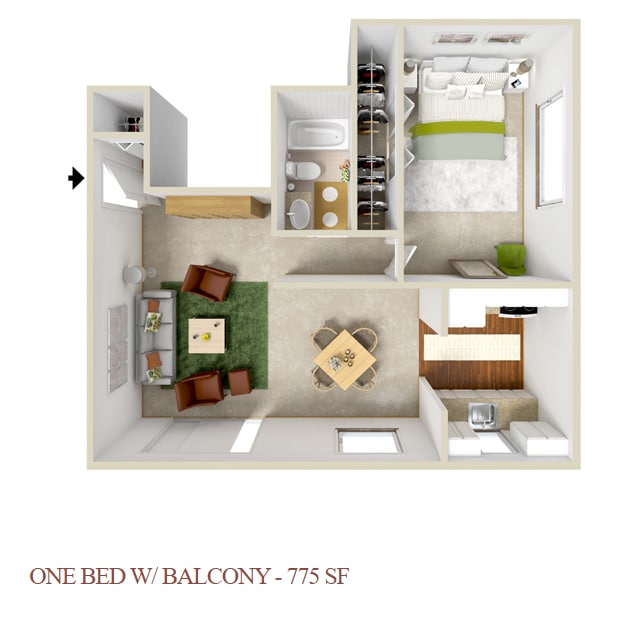 Modelo de apartamento: 775 SF$1,2751 Dormitorio, 1 Baño, 775 sq ftDisponible Ahora![]()