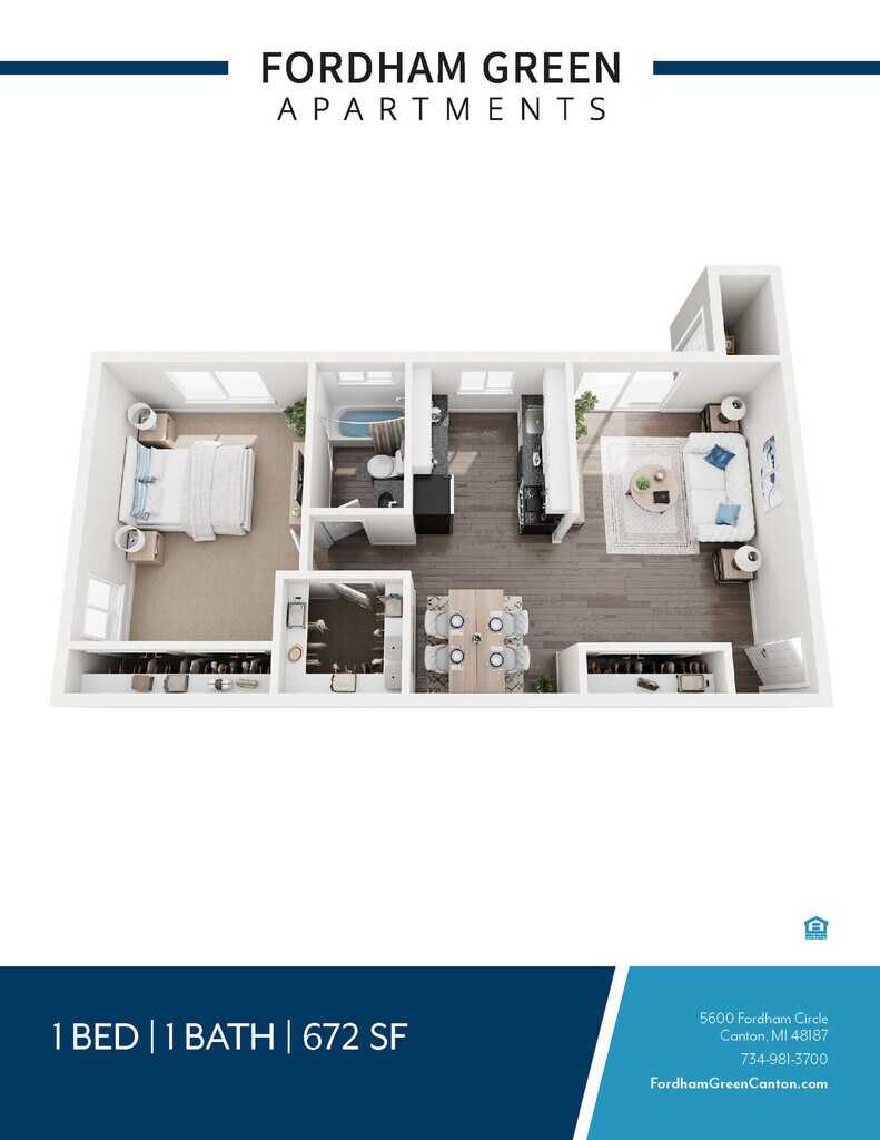 1 Dormitorio, 1 Baño, 672 pies²Disponible January 15, 2026Galería del Modelo