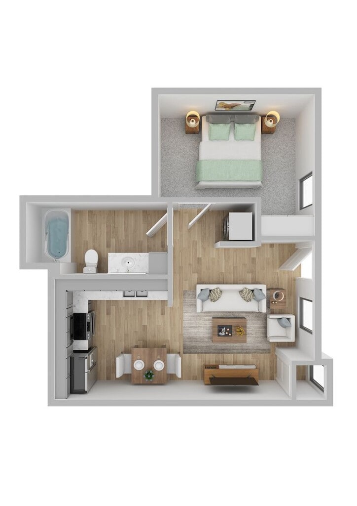 1 Dormitorio, 1 Baño, 590 pies²Disponible AhoraEl más grandeEsta opción tiene las unidades más grandes para este modeloGalería del Modelo