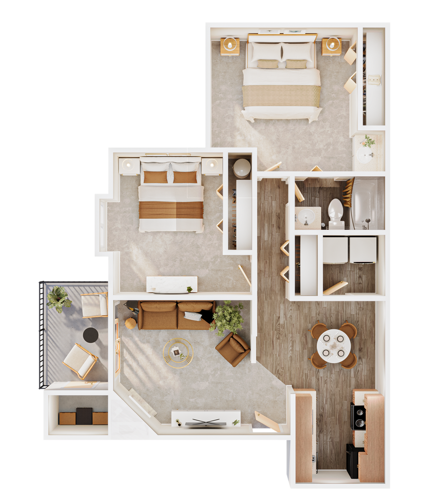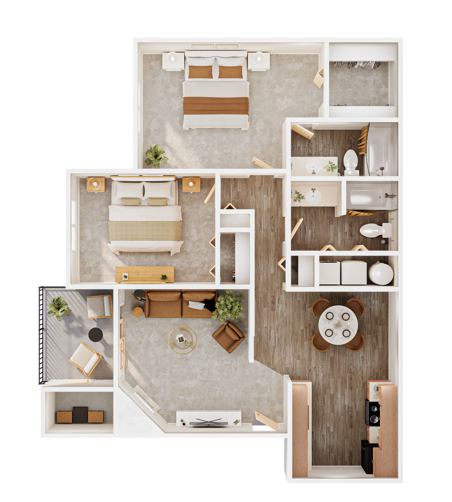 Modelo de apartamento: 2x1$2,3432 Dormitorios, 1 Baño, 896 sq ftDisponible April 14, 2026![]()