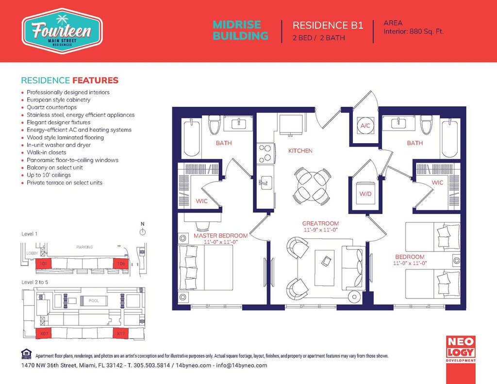 Fourteen Main Street Residences ofrece apartamentos de 1 a 2 Dormitorios desde $2,153 con 585–890 pies cuadrados. Aquí está el precio actual y la disponibilidad: