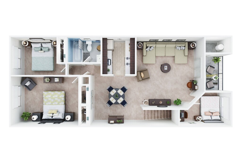 Modelo de apartamento: 2 Bedroom TownhouseDesde $1,8852 Dormitorios, 1.5 Baños, 1000 sq ftNo Disponible2 Bedroom Townhouse - Plano 1 3 Dormitorios