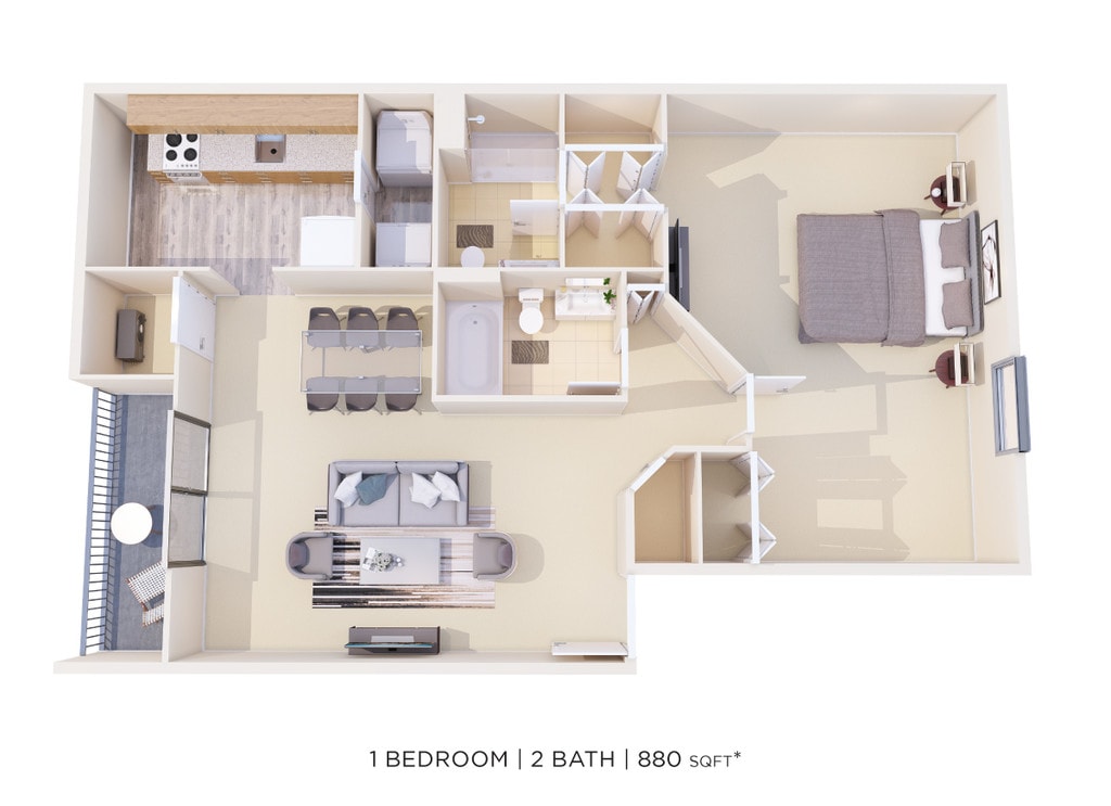 1 Dormitorio, 2 Baños, 880 pies²Disponible AhoraGalería del Modelo