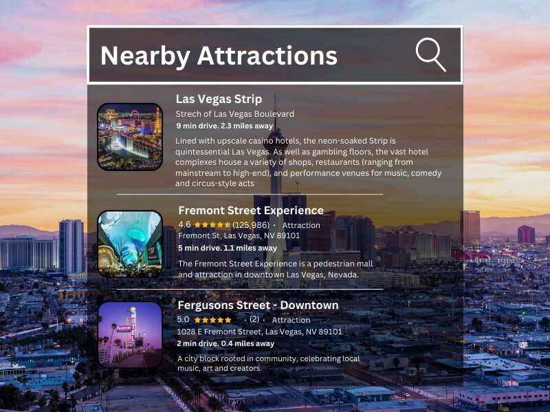 Fremont Villas tiene 5 parques en un radio de 5.8 millas, incluyendo The Old Mormon Fort State Historical Park , Bellagio Conservatory Botanical Gardens, Flamingo Wildlife Habitat, Mystic Falls Park, y Spring Mountain Ranch.