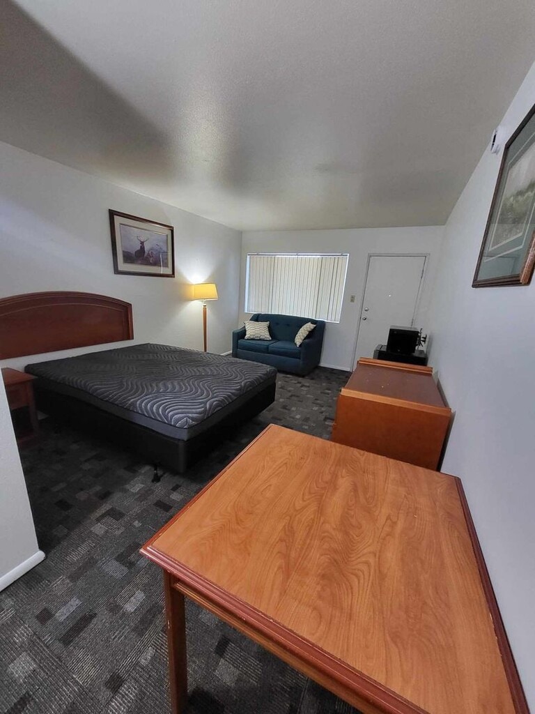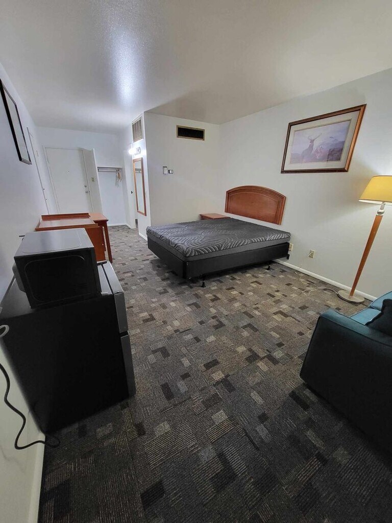Newer carpets and paint. On-site laundry and ice machine too! All studios are fully equipped with a premium bed, dresser, table w/chairs, lamps, fridge, microwave and private bathroom. All units have separately keyed deadbolts and all common areas are accessed via key-code locks. Our camera system provides around the clock coverage of all common areas and private parking spaces. No long-term contract required and several unit types and prices available ranging from $550 to $600 per month. Please be aware there is an additional per adult utility bundle charge of $100/month that covers water, sewer, garbage, electric, heat, WiFi and Cable TV. Incredible price and location!! Apply now or contact us for more information. Bedding and TVs not included.