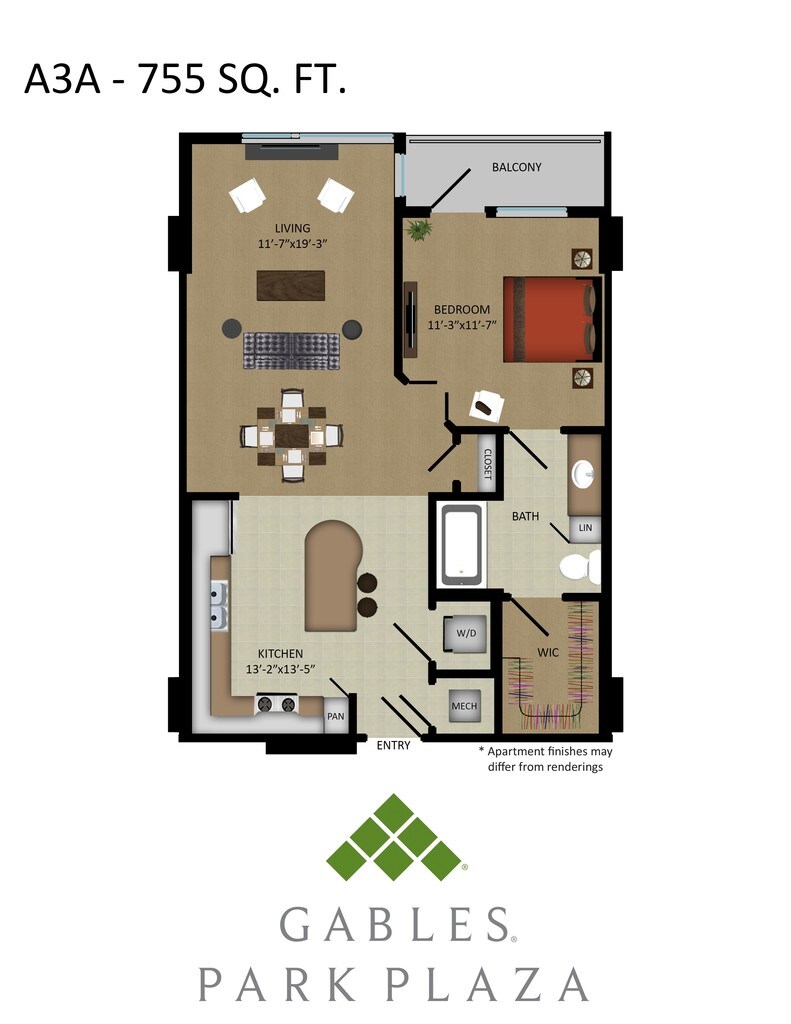 A3 - Plano 1 Unidad de apartamento: 213Modelo de apartamento: A3$1,9931 Dormitorio, 1 Baño, 706 sq ftDisponible AhoraPlano: A4