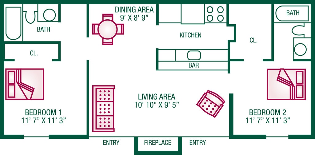 2 Bedroom / 2 Bath - Plan B - Plano 1 2 Bedroom / 2 Bath (with Fireplace) - Plan A